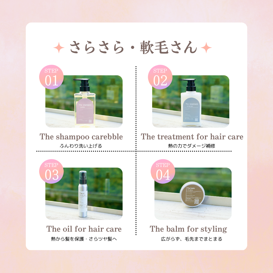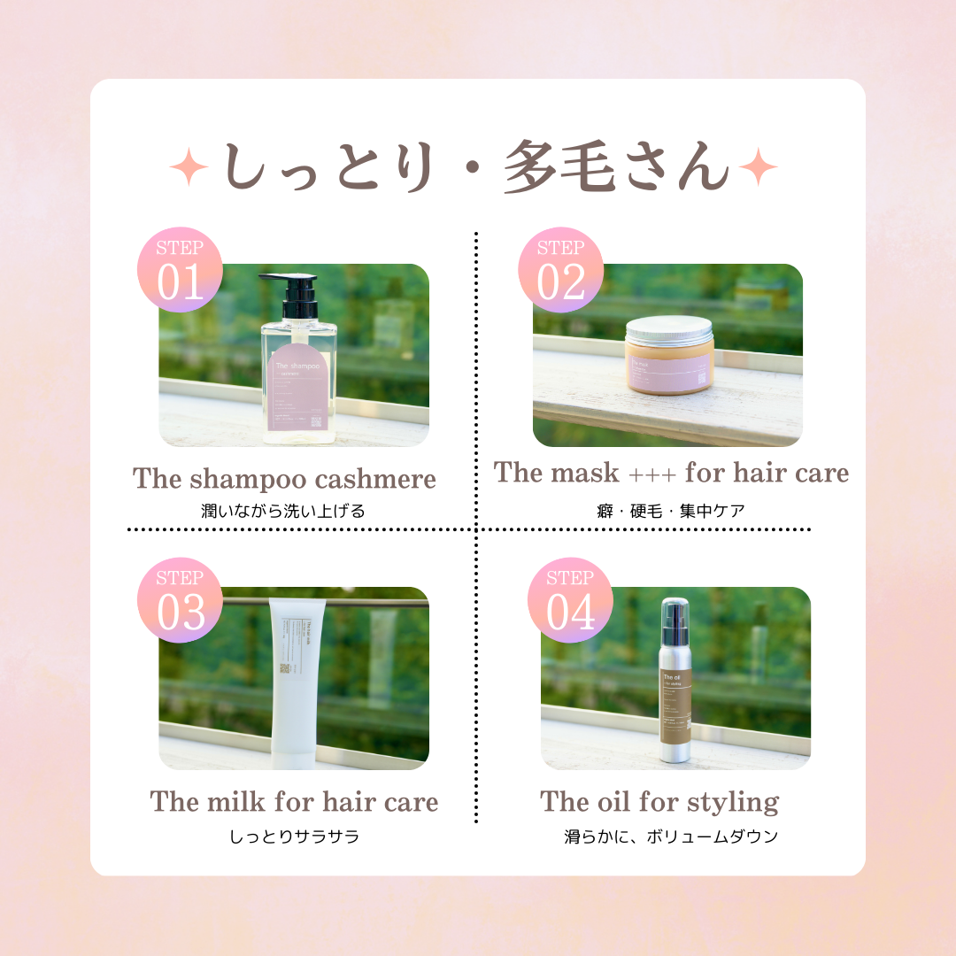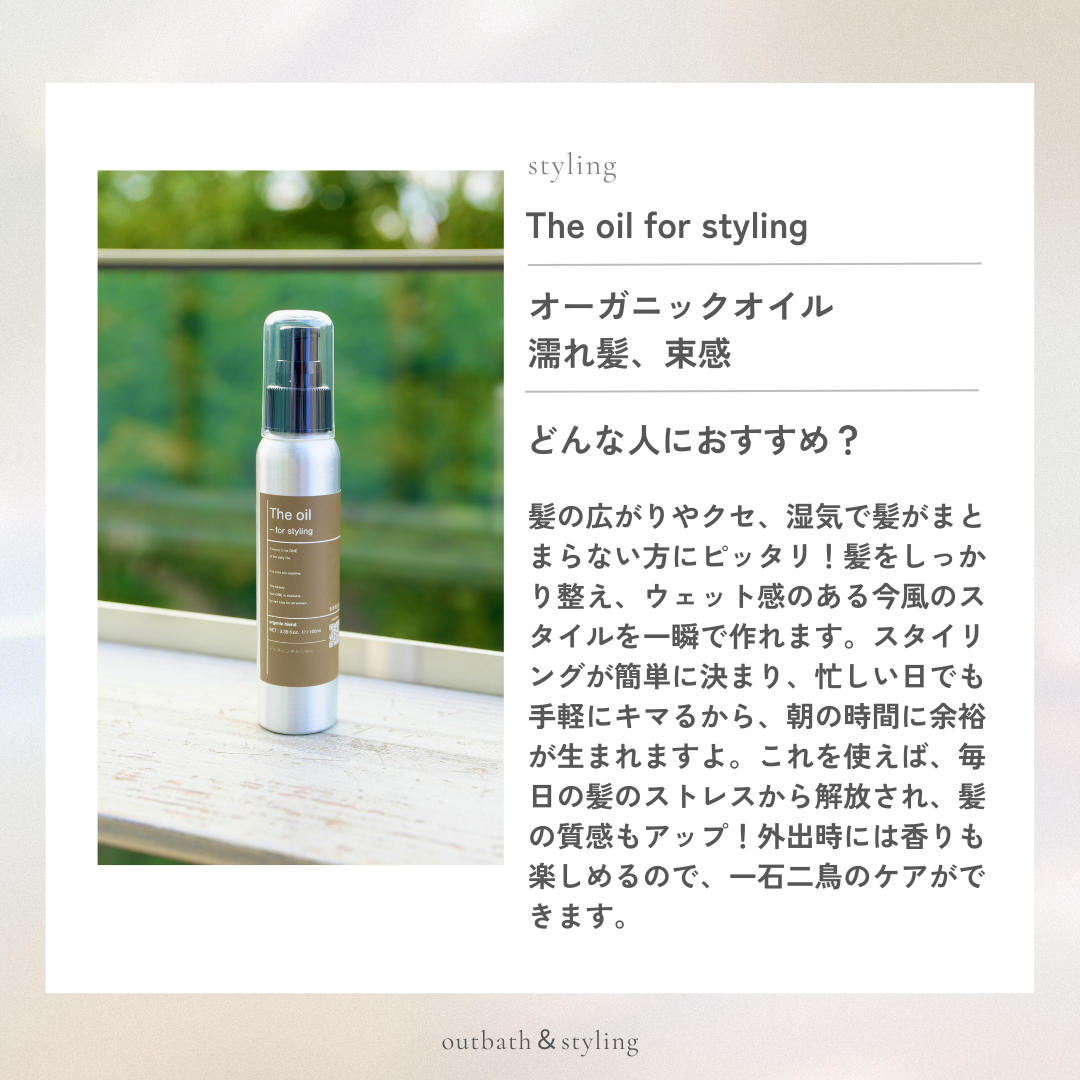 オレイン酸を多く含んだ良質なオーガニックオイルでスタイリングすることで濡れ髪 / 束感 / 毛先の動き / ツヤを出し、 クセ / 湿度による広がりを抑えます。